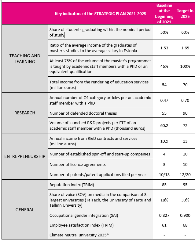 Key indicators of the Strategic Plan 2021– 2025 of Tallinn University of Technology